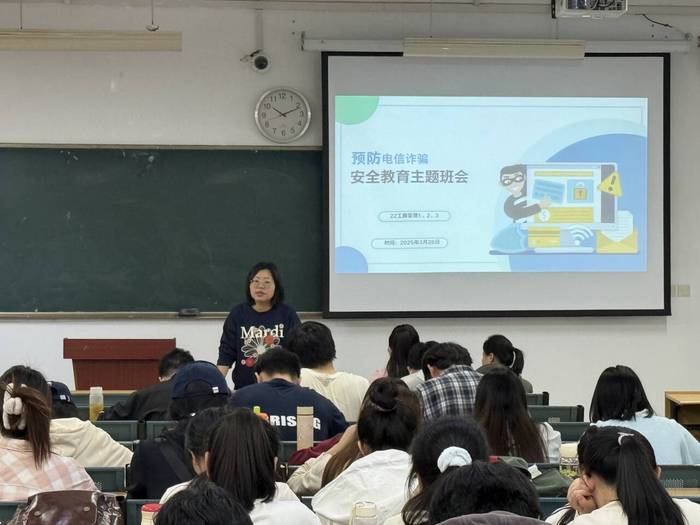 多方协同,构建反诈“共同体”。此次全员班会依托警校联动机制,整合多方资源。校保卫处、学生处联合属地公安持续开展反诈预警和典型案例宣教,营造反诈教育氛围;学院、辅导员结合学生年级、专业特点定制班会内容,确保教育精准性。活动还通过班级群等平台推送预警信息,形成线上线下立体化宣传矩阵。