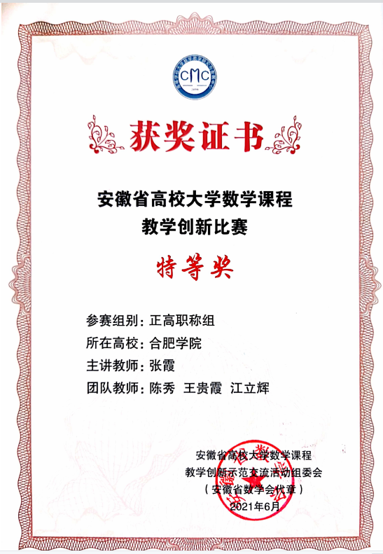 在这个过程中,团队不断优化整合课程内容,降低基础数学课和专业课内容的重复性,将课程内容体系从“以学科为导向”转变成“以专业为导向”,原本“各自为政”的课程内容在模块化课程内容体系改革中逐渐走向深度“融合”。源浚者流长,根深者叶茂。2020年,《工程应用数学A》入选首批国家级线下一流本科课程,这也是大学数学教学团队18年来推进数学教学改革结出的硕果。2021年张霞获安徽省高校大学数学课程教学创新大赛(正高组)特等奖。