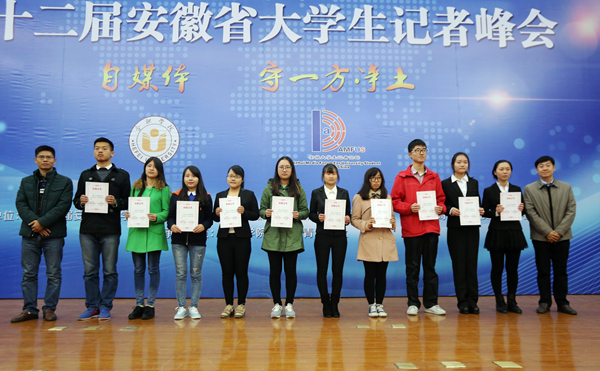 随后,2015年安徽省校园十佳新闻记者、2015年度安徽省高校校园“好新闻奖”获得者、峰会“自媒体 守一方净土”主题征文比赛获奖名单公布。主题征文获奖代表、2015年度安徽青年报《大学生周刊》“十佳”学生记者和 “十佳”学生记者站依次上台领奖。校园“好新闻奖”通讯类一等奖获得者安徽农业大学姚安琪和消息类一等奖获得者安徽师范大学皖江学院李玲玲分别上台发表讲话。