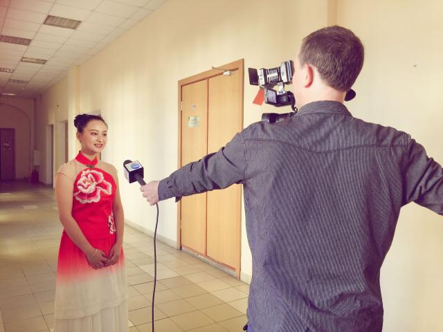 515日,在我校与俄罗斯青年合唱团、莫斯科室内合唱团、俄罗斯混声合唱团、俄罗斯女子合唱团等五个知名合唱团体联袂演出之前,新华社俄罗斯分社记者专程来到我校合唱团排练室,再次采访了许刚和合唱团学生成员朱田园,两人分别从学校的基本情况介绍、学校领导的支持与重视、合唱团训练前期的筹备,歌曲的选择,参与活动的意义和收获,国际艺术节对国家青年交流和对外文化交流方面的意义等进行了介绍。新华社俄罗斯分社记者还特意在演出现场录制了我校合唱团演唱的《彩云追月》、《回娘家》等中国民族歌曲,并在闭幕式现场对我校合唱团进行了节目跟拍。